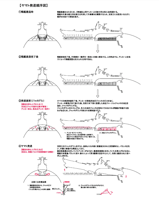 さて、この施工・発進プロセスにある「アンカー」および「支保工」の規模や詳細はどのようなものか。仮にヤマトの重量を、偽装および艦載機、弾薬等の余裕も鑑み10万tとして検討した結果が下である(図14)。