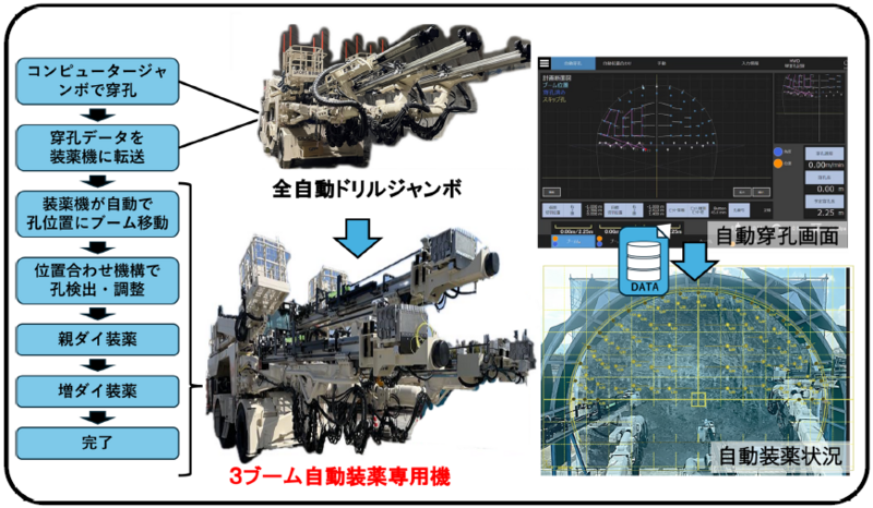 自動装薬システムを搭載した『3ブーム自動装薬専用機』が完成 ~ドリルジャンボとの穿孔データ連携により装薬一連作業を自動化~