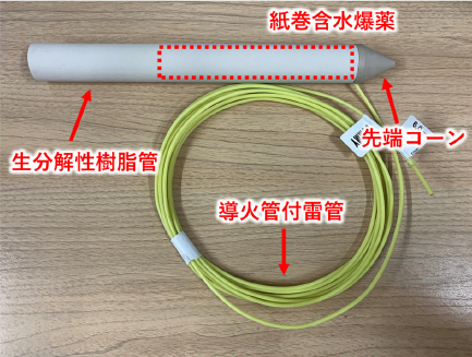 親ダイは紙巻含水爆薬と非電気式雷管(導火管付雷管や無線電子雷管)の組合せとし、先端コーン(位置合わせ誤差・孔荒れ対策)と生分解性樹脂管(収納・把持機能)に内包してカートリッジ化しました(写真-2)。親ダイカートリッジ外装に生分解性樹脂を使用することで、時間経過とともに分解されるため、トンネル掘削ずり(トンネル掘削後で出る破砕された岩塊)への産業廃棄物などの異物混入を防ぐことができます。