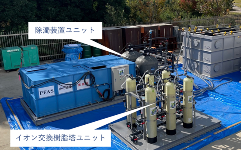 「除濁装置ユニット」は、処理対象水の中に含まれるPFOS・PFOAを効率よく除去する上で阻害要因となる微細な砂やゴミなどの懸濁物を取り除く装置です。その後工程である「イオン交換樹脂塔ユニット」は、PFOS・PFOA処理専用に開発されたイオン交換樹脂が充填されており、PFAS類を効率的に除去する装置です。