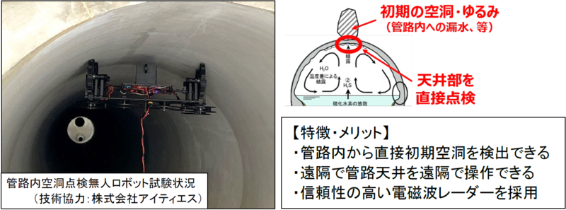 本技術は、無人で管路内の天井部を走行できる点検ロボットにより。電磁波レーダーを用いて管路内から直接、管路背面(管路の外側)の空洞を調査します。そのため、初期空洞の検出が可能となるだけでなく、管路内調査のもう一つの課題である、調査員の管路内立ち入りが困難となる管路内でも遠隔操作により安全な調査の遂行が可能となります。さらに上述の硫化水素劣化予測診断から、高リスクと判断された特定の管路に対する予防保全のための状態監視技術としての活用も期待できます。