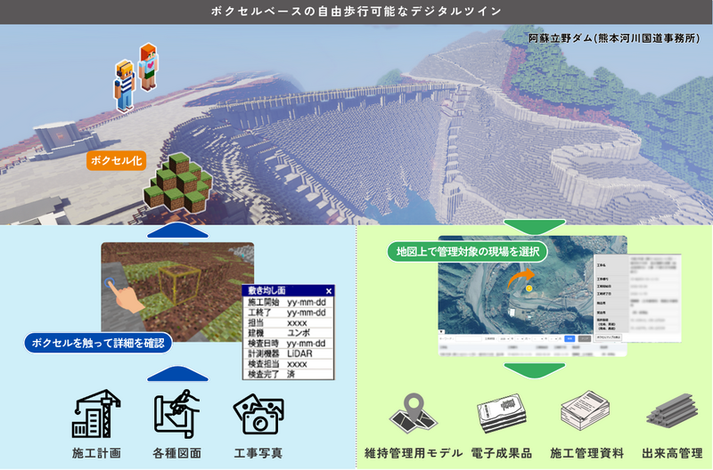 本取組は、世界的に親しまれているビデオゲームのボクセル型空間表現を社会インフラ分野のデジタルツインへ応用し、専門知識を要しない直感的なインフラ管理・活用のためのシステム(以下、「本システム」)として構築をしました。