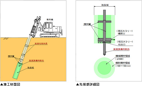 本工法は、軟弱地盤を対象とした地盤改良工法で、機械撹拌と撹拌翼先端からの固化材スラリーの高圧噴射の併用により、地盤中にラップ可能なソイルセメントコラムを造成するものです。通常、ソイルセメントコラムは鉛直方向しか造成できませんが、本工法は、斜め方向にも造成可能です。