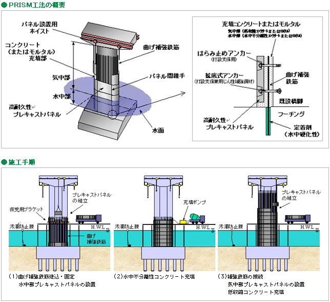本工法は、大規模な仮締切を省略できるとともに、ドライアップを必要としないRC橋脚の耐震補強工法で、補強用鋼材を内包した高耐久性プレキャストパネルを気中でリング状に組み立てて水中に沈設し、既設橋脚との間に水中不分離性コンクリート(またはモルタル)を充填して、既設橋脚と一体化させる耐震補強工法です。
